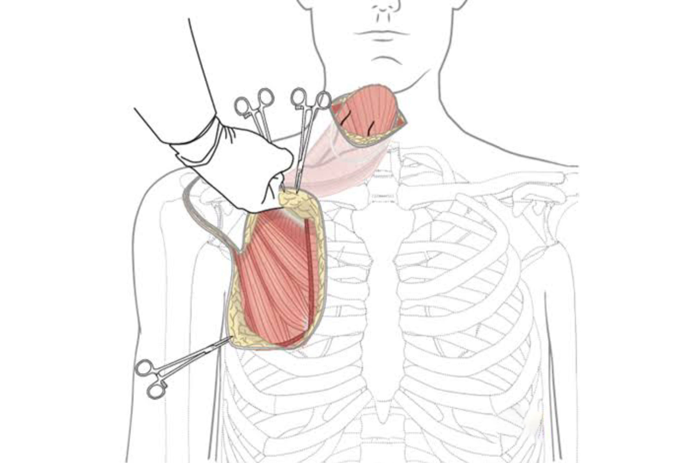 - A pedicled flap using tissue from the pectoralis major (chest muscle), including skin, muscle, and blood vessels.